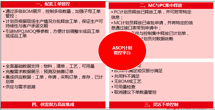 基于OracleASCP标准需求,TKF开发一套生产计划,采购计划与主需求配套的MRP开发平台,主要关注物料欠料,供需平衡,产能计划及公用料计算等问题,平台主要需求如下: